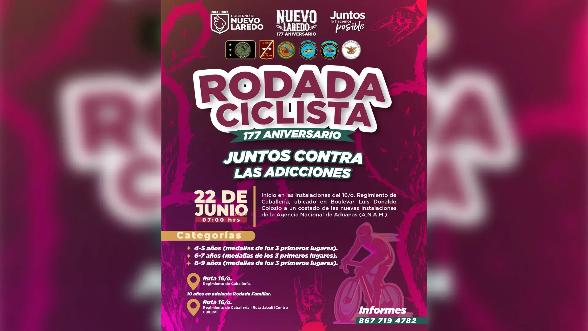 Acompáñanos este 22 de junio a las 07:00 a.m. en una rodada llena de energía, salud y unión familiar, con salida desde el 16/o. Regimiento de Caballería (Bulevar Luis Donaldo Colosio).
