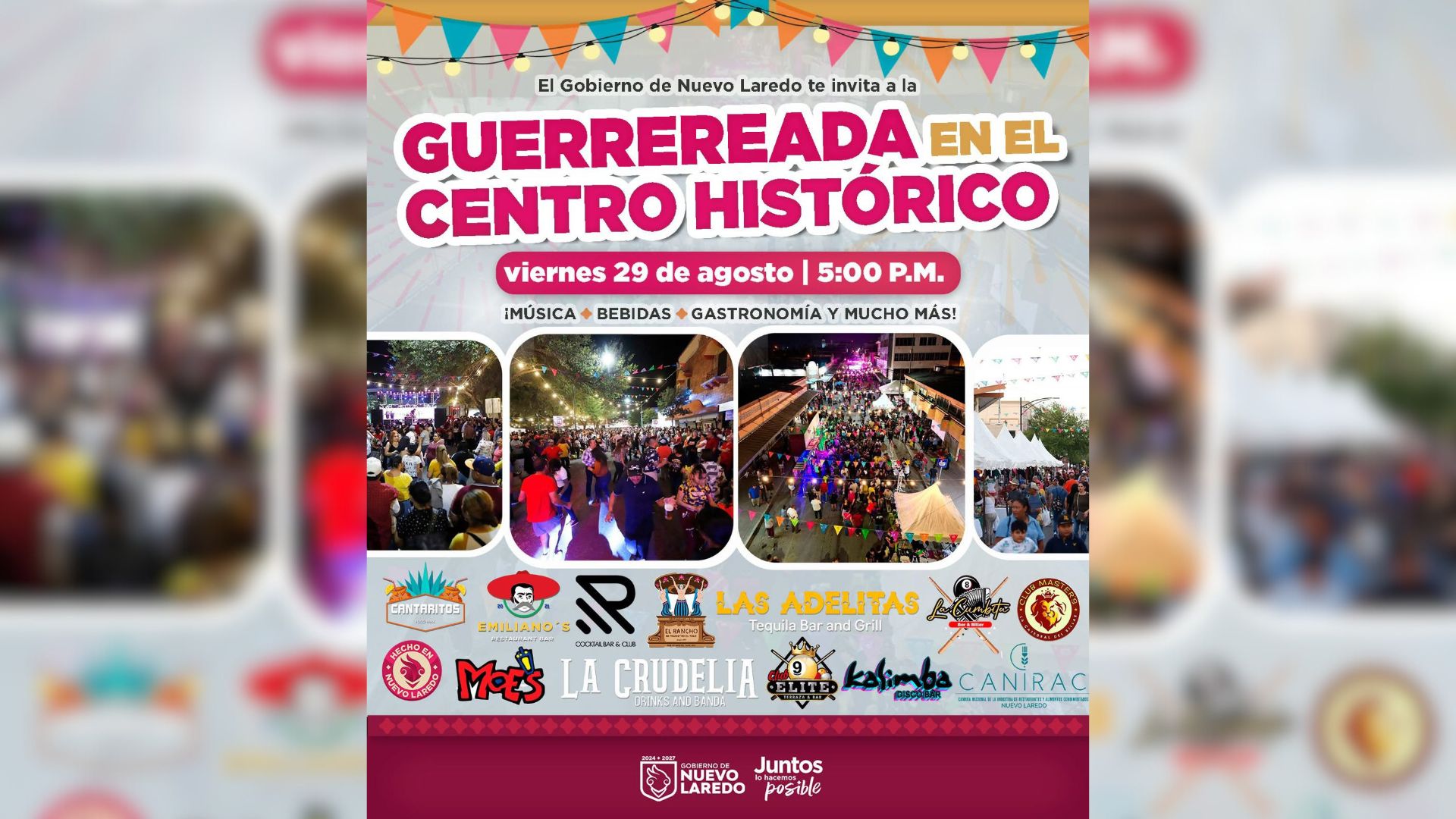 El Gobierno de Nuevo Laredo te invita a la Guerrereada en el Centro Histórico este viernes 29 de agosto a partir de las 5:00 p.m. Disfruta de música en vivo, bares, gastronomía y un gran ambiente familiar. 🎶🍴✨