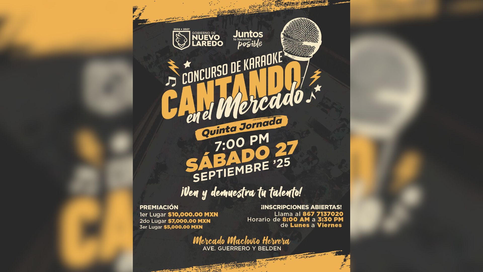 El Gobierno de Nuevo Laredo a través de la Dirección de Turismo 2024-2027 te invita a participar en la 5ta jornada del Concurso de Karaoke Cantando en el Mercado, un evento lleno de talento, música y más 🥳