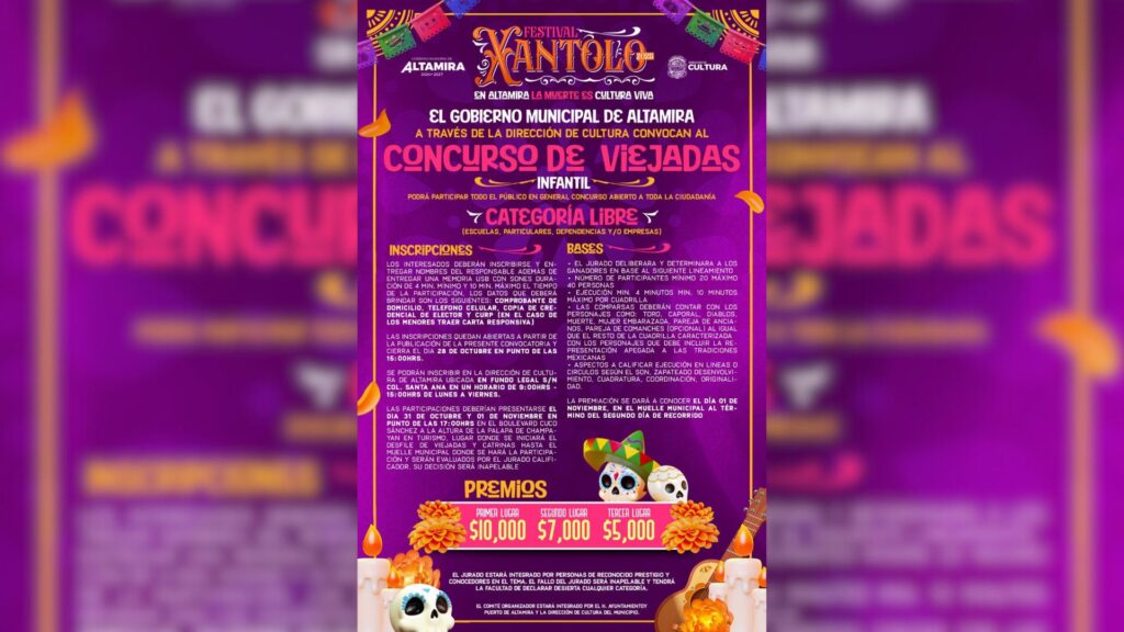 🎉Xantolo 2025 en Altamira 🎭El Gobierno Municipal de Altamira tiene el honor de invitarte a participar en la tradicional celebración de Xantolo Altamira 2025, una festividad que honra la memoria de nuestros seres queridos.Te extendemos una cordial invitación a formar parte de los concursos de:⚰️Altares flotantes✝️ Catrinas🎭ViejadasHabrá importantes premios para los primeros lugares.¡Inscríbanse y sean parte de esta gran tradición! Zona Sur
